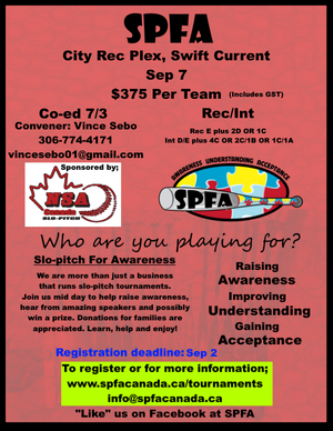Slow Pitch for Awareness (SPFA or the Autism Tourney) is coming up September 7th, 2024. Deadline to register is September 2nd, 2024. Spots are filling up so get registered ASAP! Go to spfacanada.ca/tournaments to register!